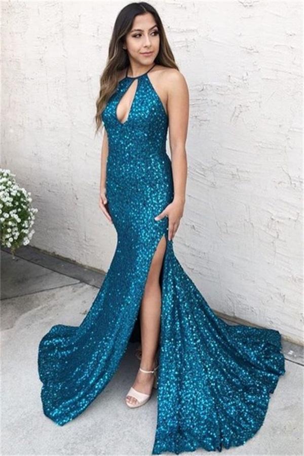Sexy Mermaid Sequins Evening Dresses Jewel Neck Backless Side Split Sweep Train Formal Prom Dress