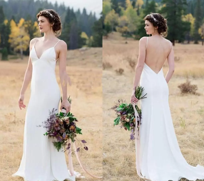 Boho Mermaid Wedding Dresses V Neck Backless Sweep Train Garden Beach Stain Bridal Gowns