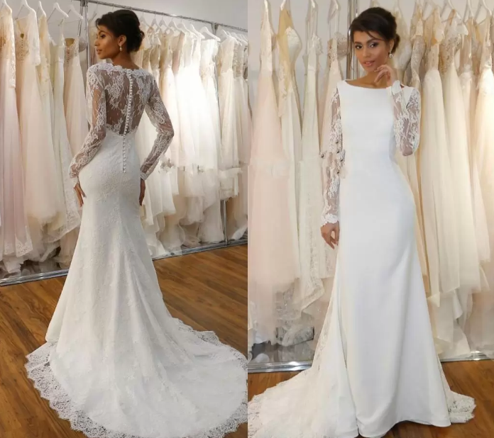 Mermaid Wedding Dresses with Long Sleeve Lace Stain Jewel Neck Covered Button Sweep Train Lace Appliques Country Boho Wedding Gown