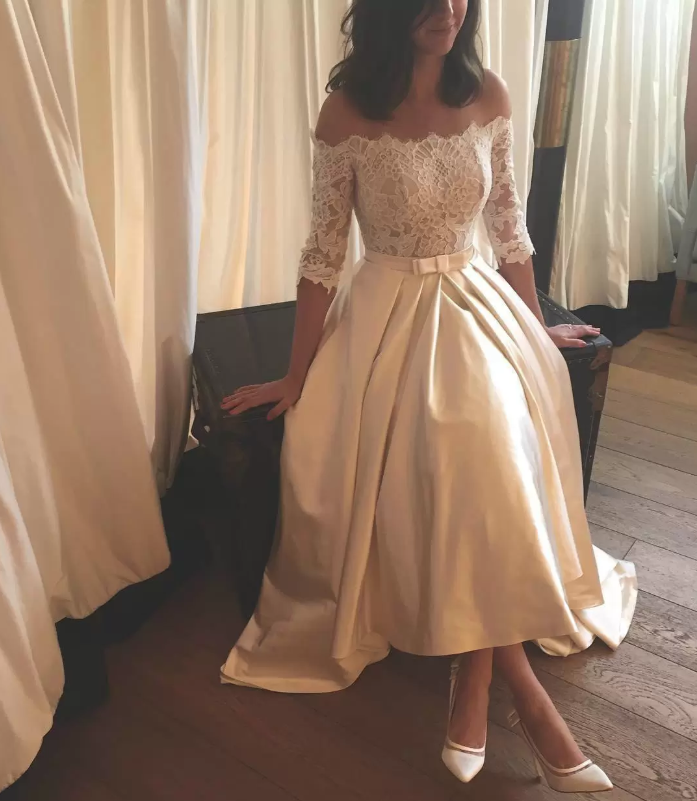Off Shoulder Lace Top Half Sleeve Short Wedding Dresses Ankle Length Stain Bow Sash Bridal Gowns