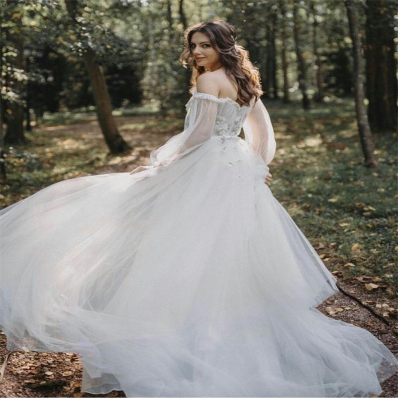 Boho Wedding Dresses Elegant Appliqued Lace A-line Bridal Dress Chiffon Long Sleeve Sweep Train