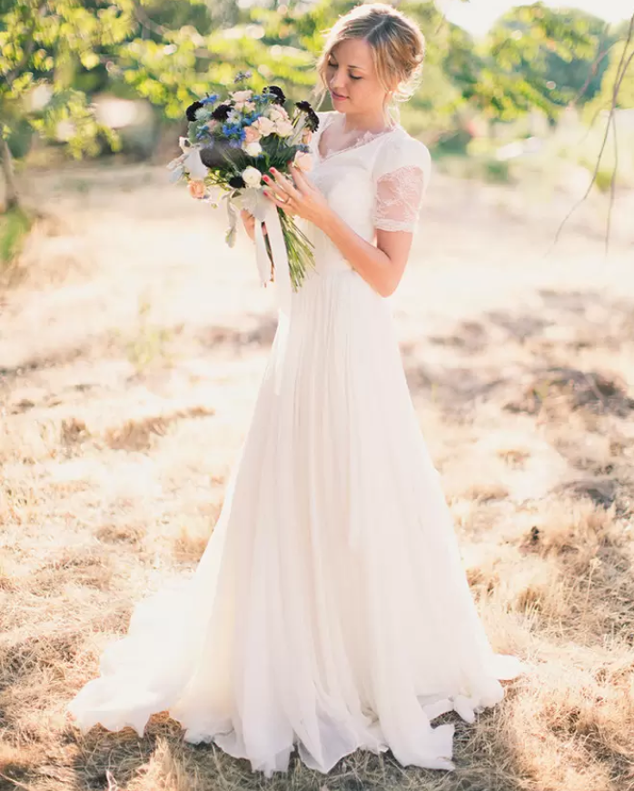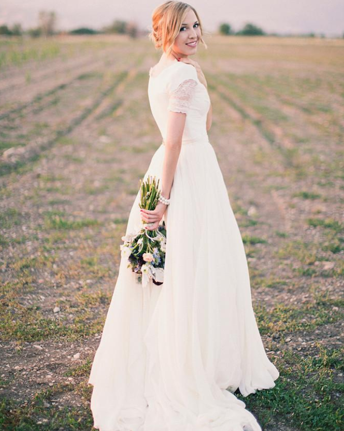 A-Line Chiffon Lace Beach Modest Wedding Dresses Short Sleeves V Neck Cheap Simple Spring Garden Wedding Party Informal Bridal Gowns