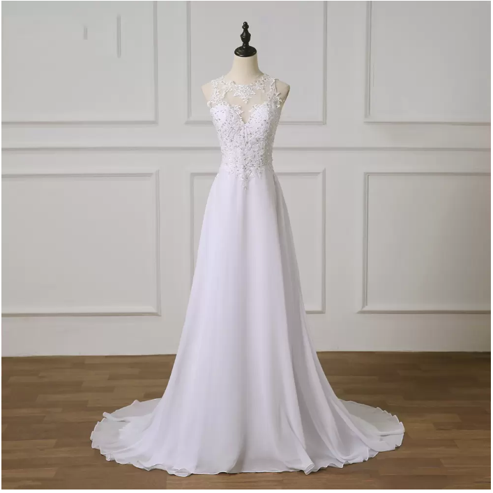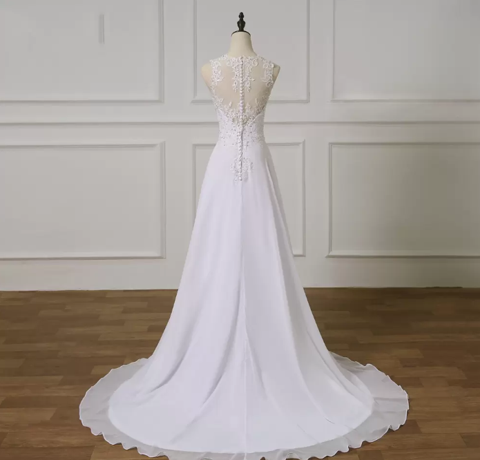 Elegant Applique Embellished Sheer Scoop Neck A-line Silhouette Chiffon Skirt Court Train Pure White Garden Wedding Dress