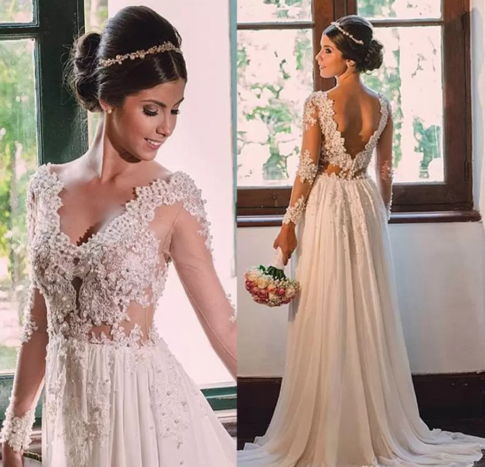 Elegant Chiffon V-neck Neckline Sheath Wedding Dresses With Beaded Lace Appliques see-through bodice Bridal Gowns