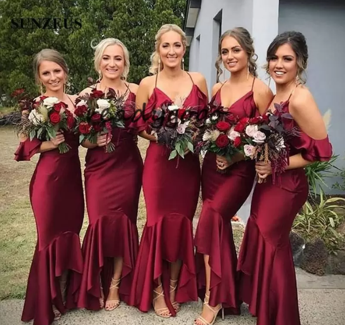 Dark Red Mermaid Bridesmaid Dresses High Low Spaghetti Strap V-neck Tea Length Wedding Party Gown