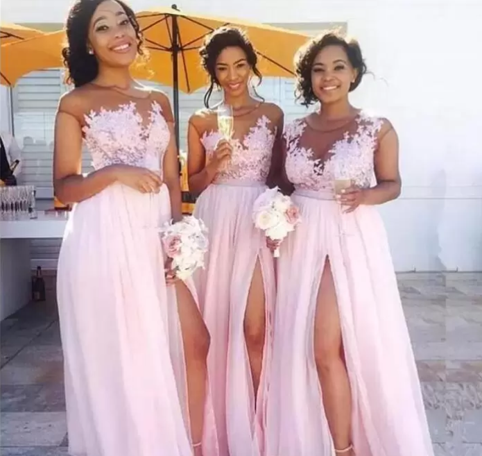 Sexy Sheer Mesh Chiffon Long Country Bridesmaid Dresses Lace Applique Split Floor Length Maid of Honor Wedding Guest Dresses