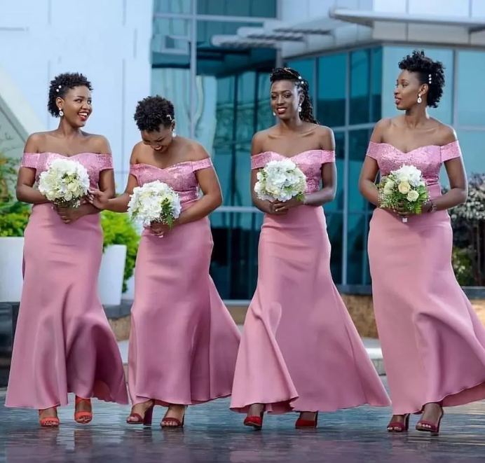 African Stretchy Mermaid Bridesmaid Dresses Off Shoulders Pink Sequins Top Wedding Guest Gowns