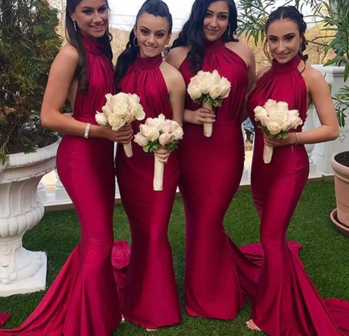 Burgundy Bridesmaid Dresses For Weddings Country Garden Style Sheath Halter Neck Open Back Pleats Long Wedding Guest Evening Prom Gowns