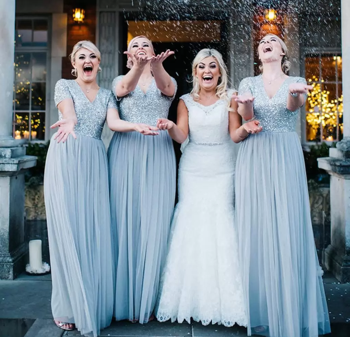 Dusty Blue Country Bridesmaid Dresses Cheap Top Sequin Prom Dresses With Short Sleeve V Neck Bling Party Gowns