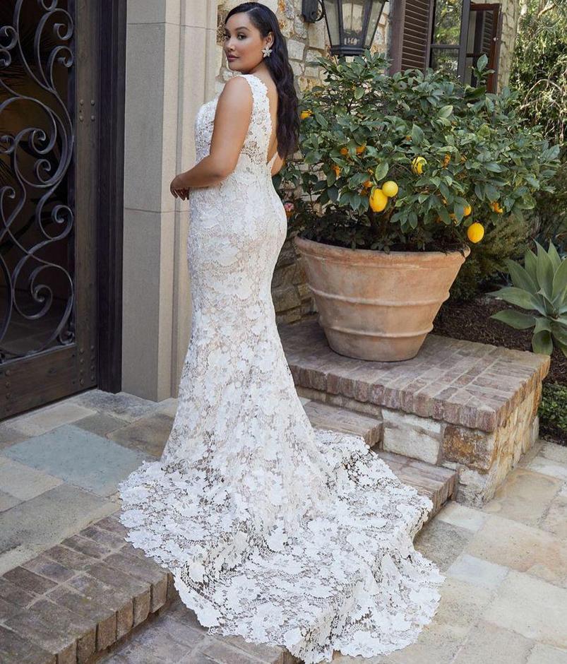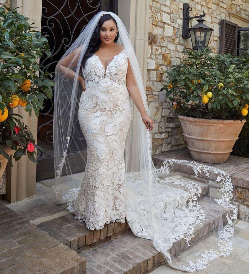 Deep V Neck Plus Size Lace Mermaid Wedding Dresses Appliqued Court Train Backless Tulle Bridal Gowns