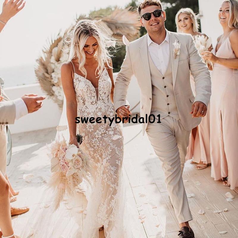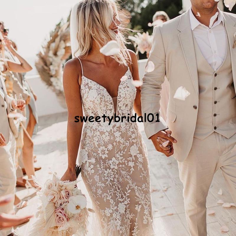 Mermaid Lace Wedding Dress Spaghetti Straps Applique V-Neck Backless Bridal Party Gowns