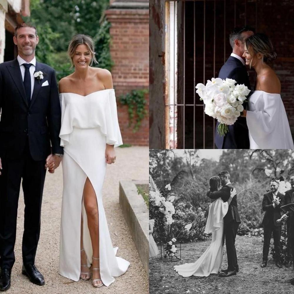 Off Shoulder Boho Garden Wedding Gowns Modern Soft Satin Long Sleeve Bridal Dress