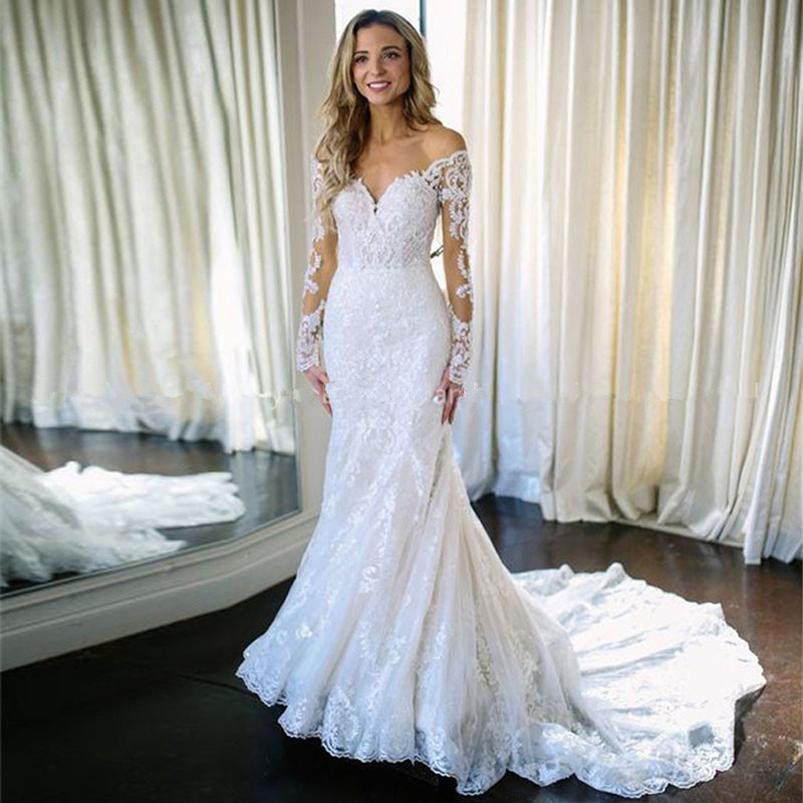 Off Shoulder Long Sleeves Lace Mermaid Wedding Dresses Appliqued Sweep Train V Neck Plus Size Tulle Bridal Gowns