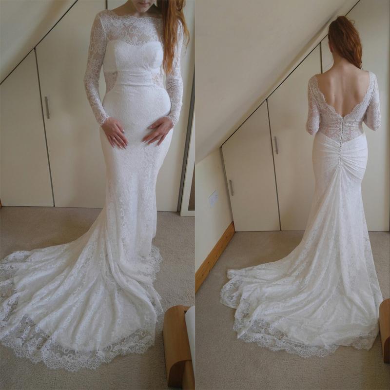 White Long Sleeve Lace Wedding Dress Bateau Neckline Mermaid Bridal Gowns