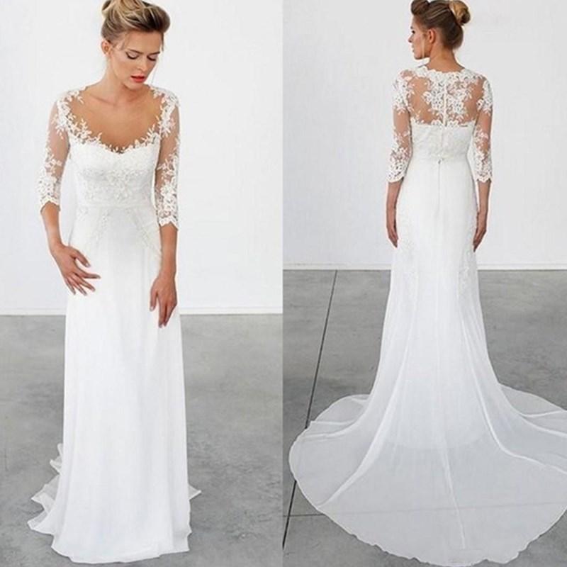 3/4 Long Sleeve Romantic Wedding Dresses Scoop with Lace Appliques Floral A Line Chiffon Bohemian Summer Beach Bridal Gowns
