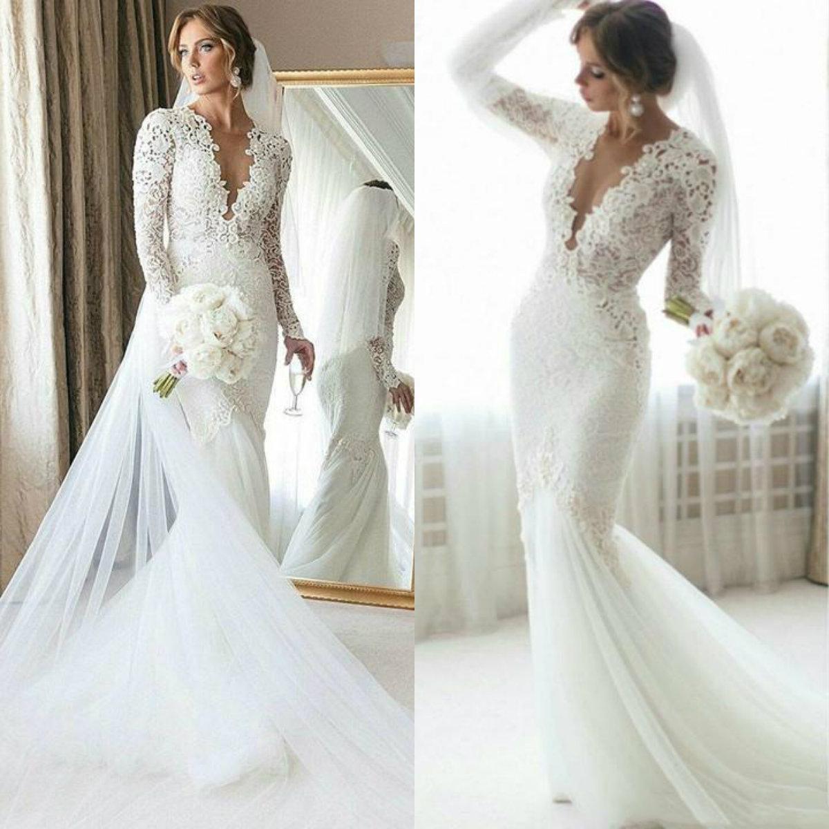 New Graceful Mermaid Wedding Dresses Illusion Deep V Neck Lace Applique Long Sleeve Spring Autum Bridal Gowns