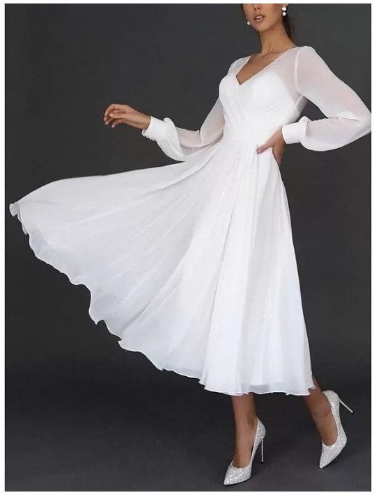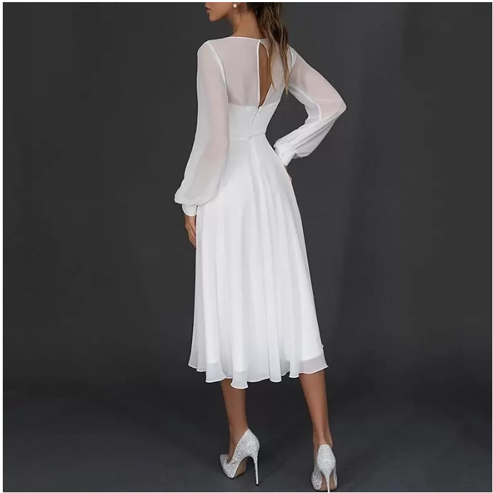 White Long Sleeve Mesh Fall Spring V Neck Elegant Romantic Wedding Dress