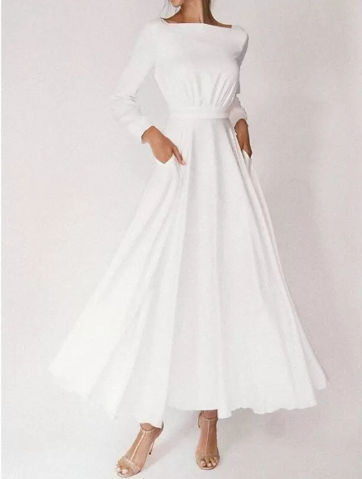White Dress Maxi long Dress White Long Sleeve Fall Round Neck Casual Wedding Dress