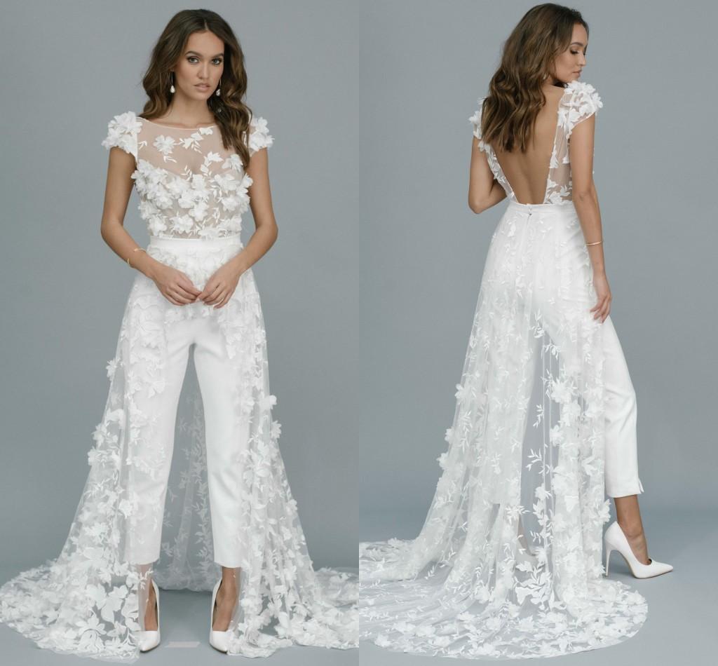 Beach Bohemian Wedding Jumpsuit with Long Train 3D Floral Applique Backless Bridal Gowns