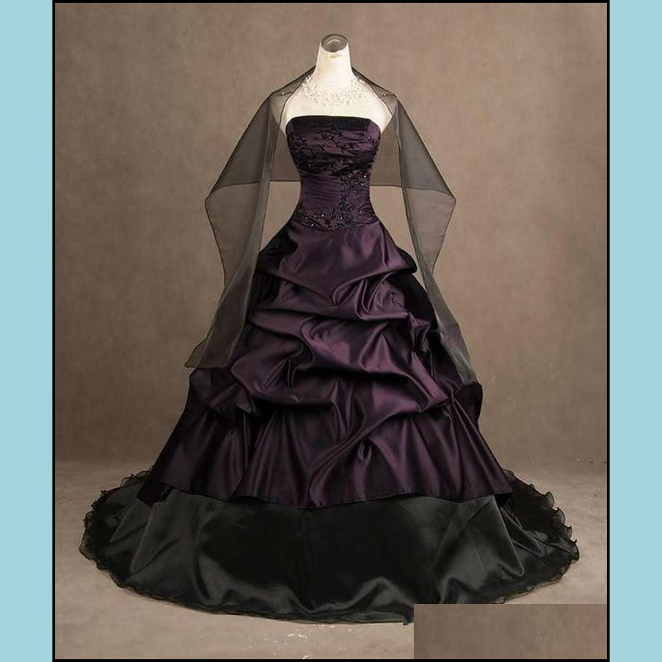 Ball Gown Wedding Dresses Party Events Gothic Style Purple And Black Strapless Satin Floor Length Bridal Gowns