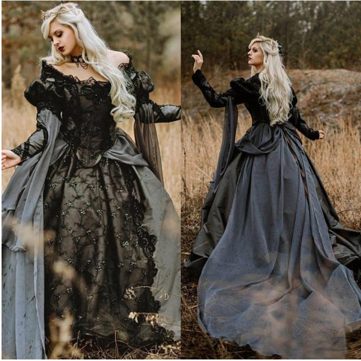Gothic Black And Gray Ball Gown Wedding Dresses Lace Appliques Puff Long Sleeve Country Garden Vintage Victorian Wedding Gowns