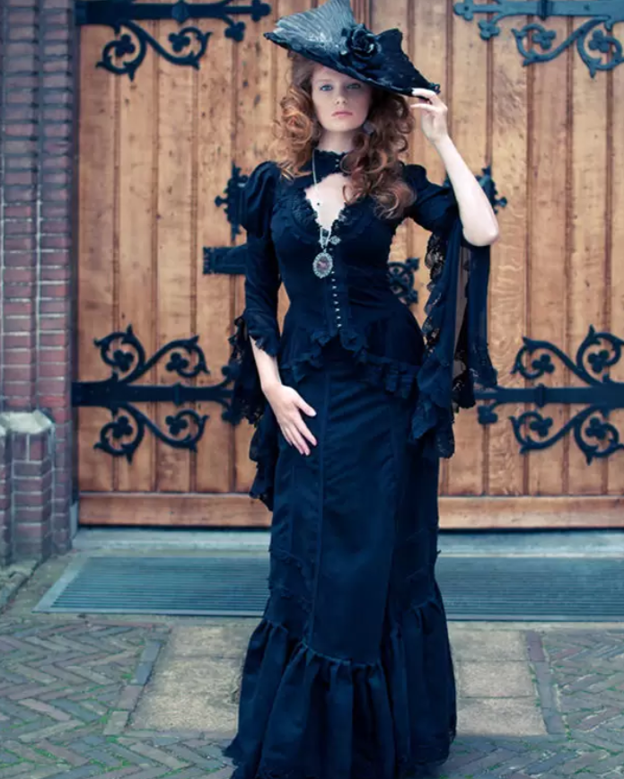 Vintage Victorian Black Mermaid Wedding Dresses Long Sleeve V-Neck Gothic Wedding Gowns Ruffles Floor Length Retro Bride Dress
