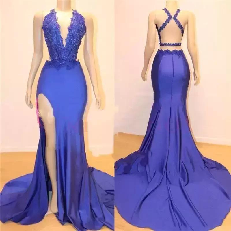 Royal Blue Prom Dresses Sexy Backless Side Slit Mermaid Sleeveless Deep V Neck Lace Applique Beaded Formal Occasion Wear Evening Gowns