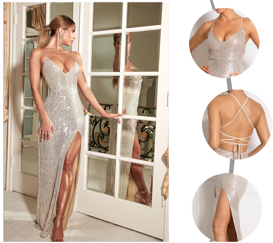 Sexy V Neck Lace Up Sequined Cocktail Party Dress Backless Split Leg Sleeveless Summer Long Dresses