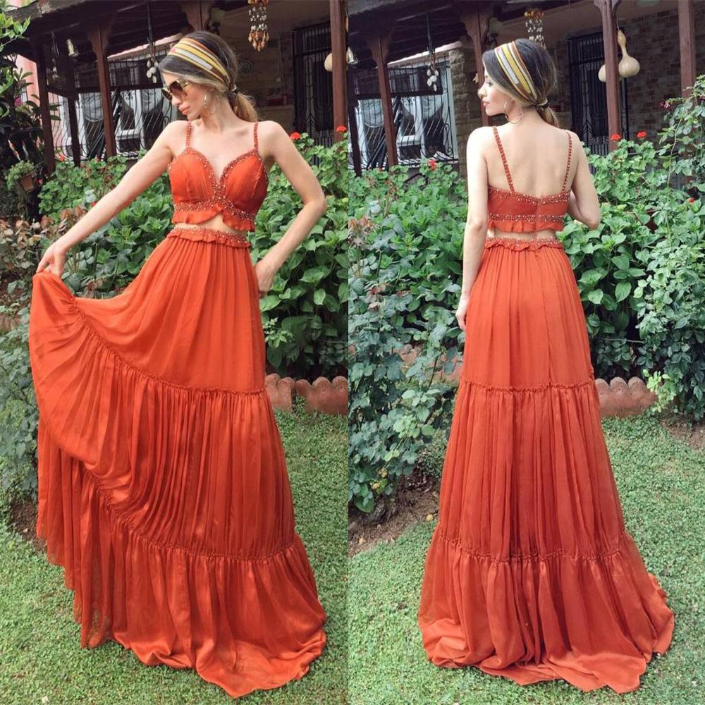 Orange Charming Evening Dresses Two Pieces Organza Custom Made Sleeveless Spaghetti V-Neck Party Prom Dress