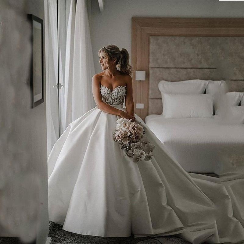 Elegant Appliques Wedding Dress Strapless Satin Simple Ball Gown Sweep Train Bridal Dresses