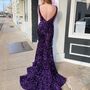 Glitter Mermaid V Neck Open Back Grape Sequins Long Prom Dress