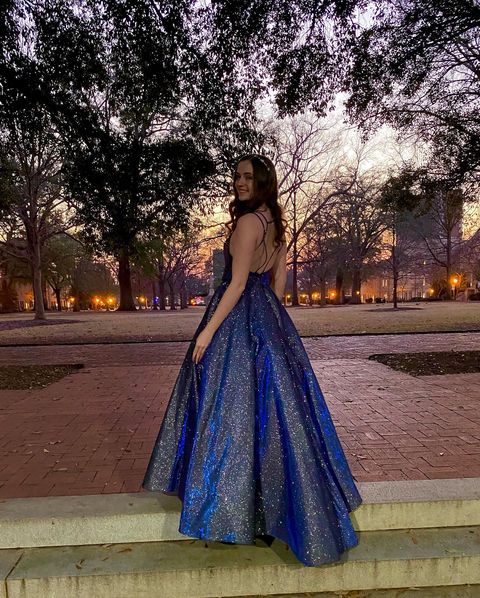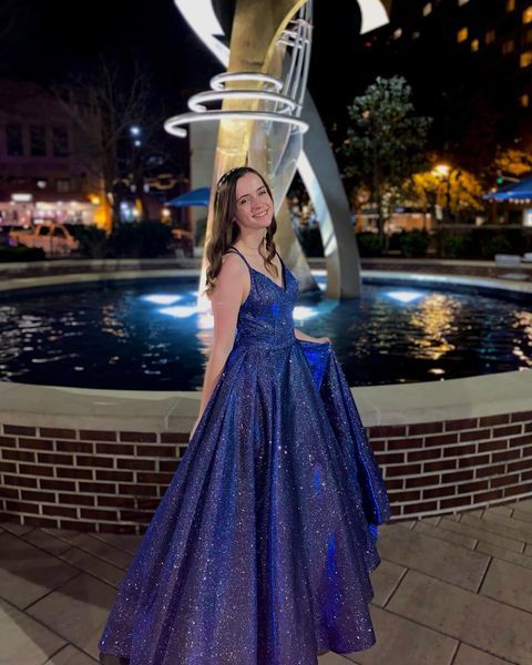 Sparkly V Neck Royal Blue Satin Long Prom Dress