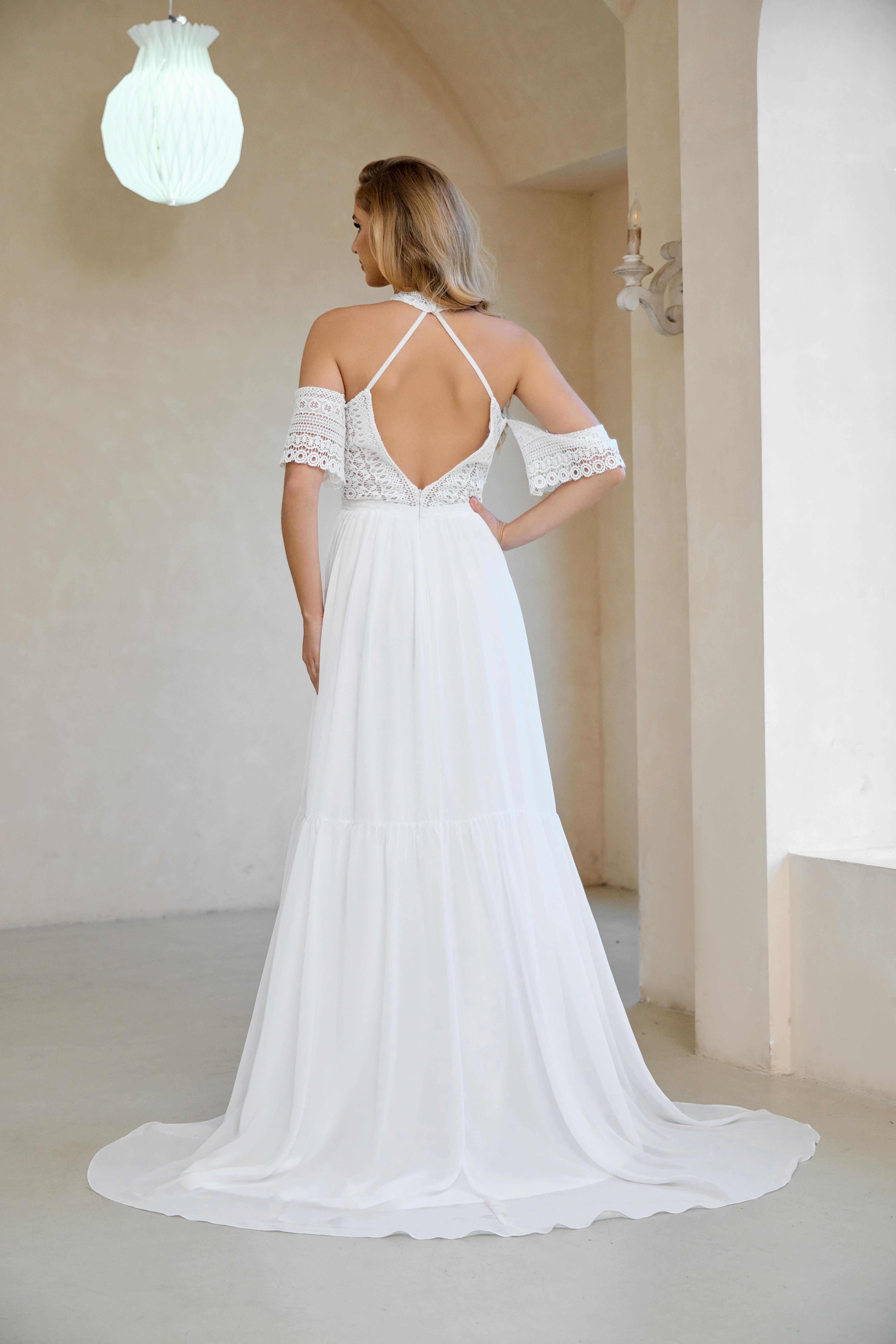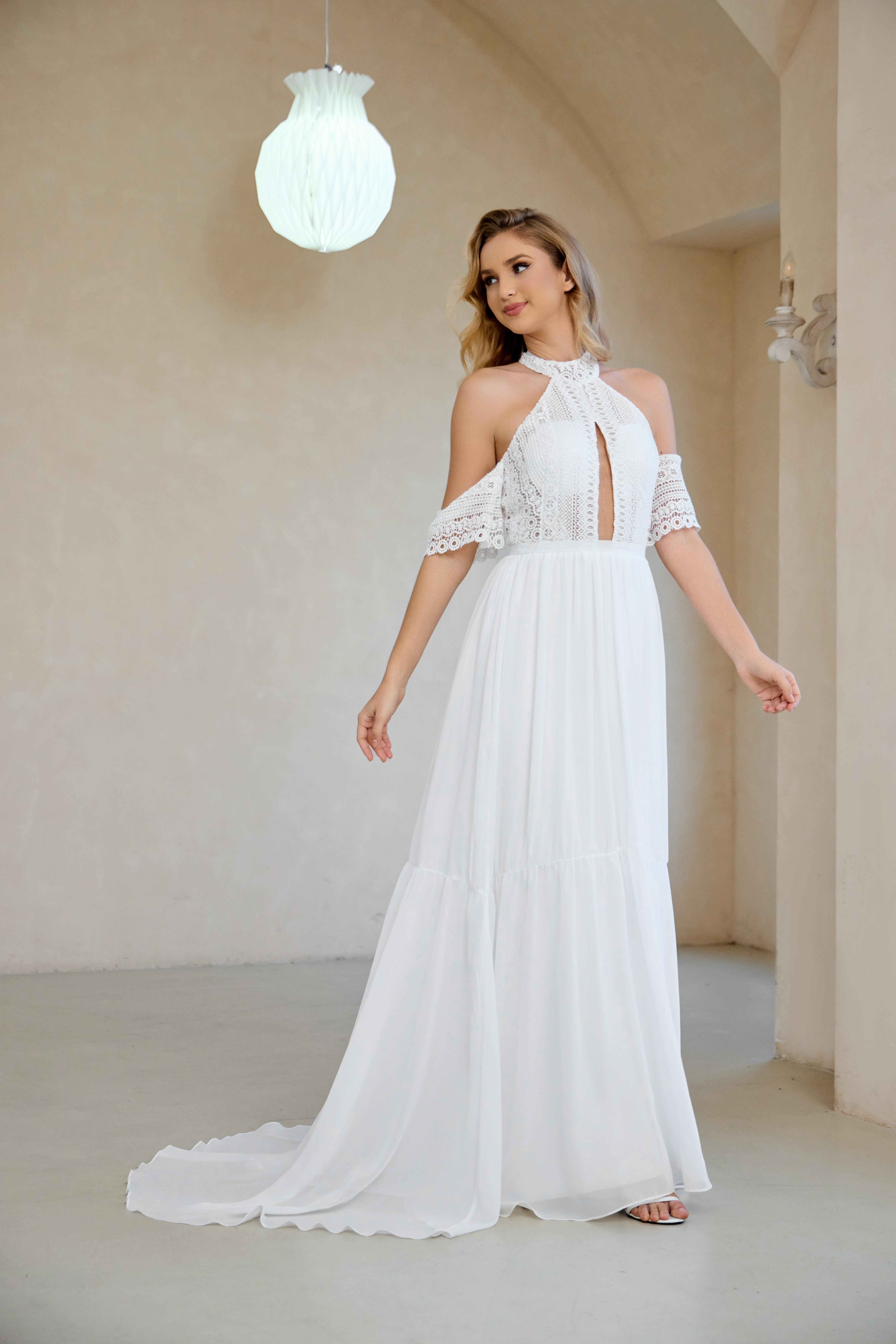 Boho Wedding Dress Cutout Lace Halter Wedding Dress A Line Racerback Closure Beach Luxe Chiffon Bridal Dress