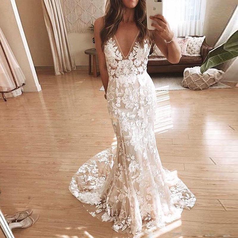 Fashion Illusion Floral Lace Wedding Dresses V Neck Sleeveless Boho Wedding Gowns Sweep Train Beach Bridal Dress