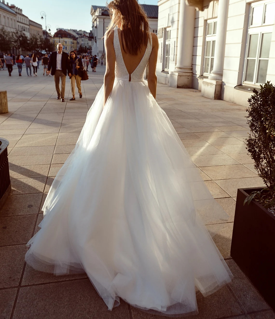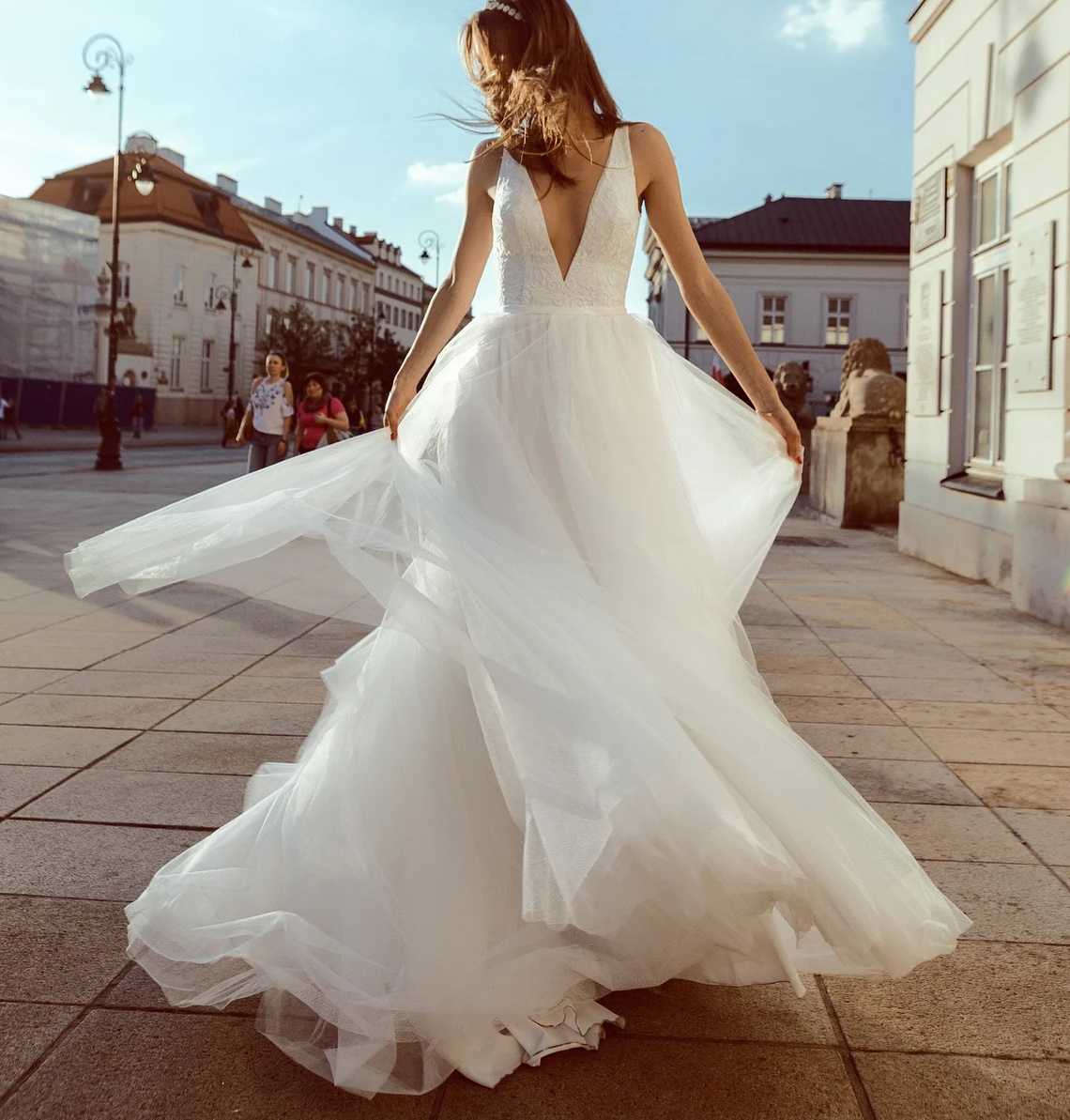 Ivory A-Line Sleeveless Gorgeous Sexy Deep V-Neck Open Back Tulle Lace Wedding Dress