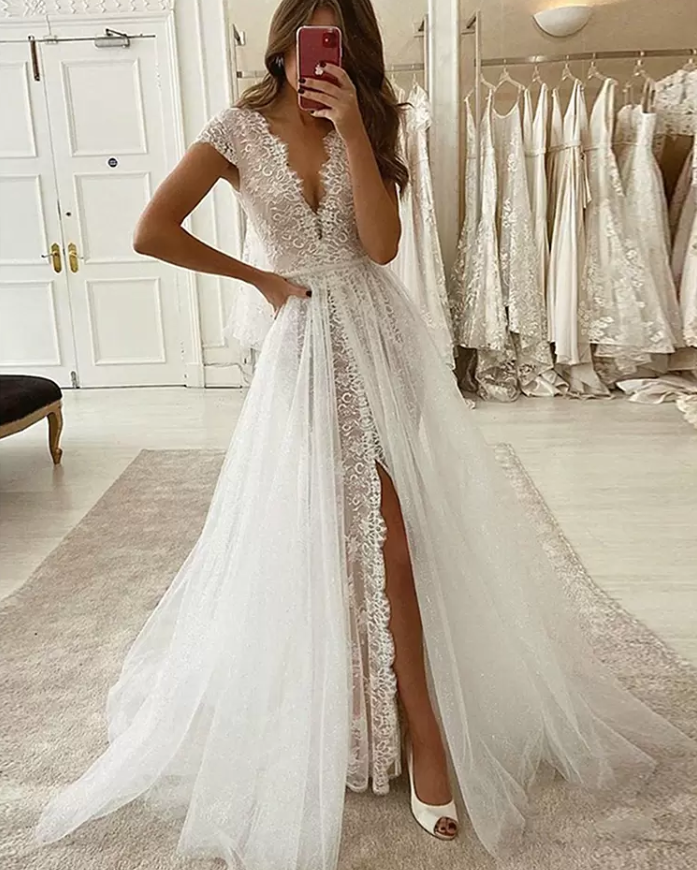 Sexy High Split Deep V-Neck Wedding Dresses with Overskirt A Line Boho Beach Lace Tulle Bridal Gowns
