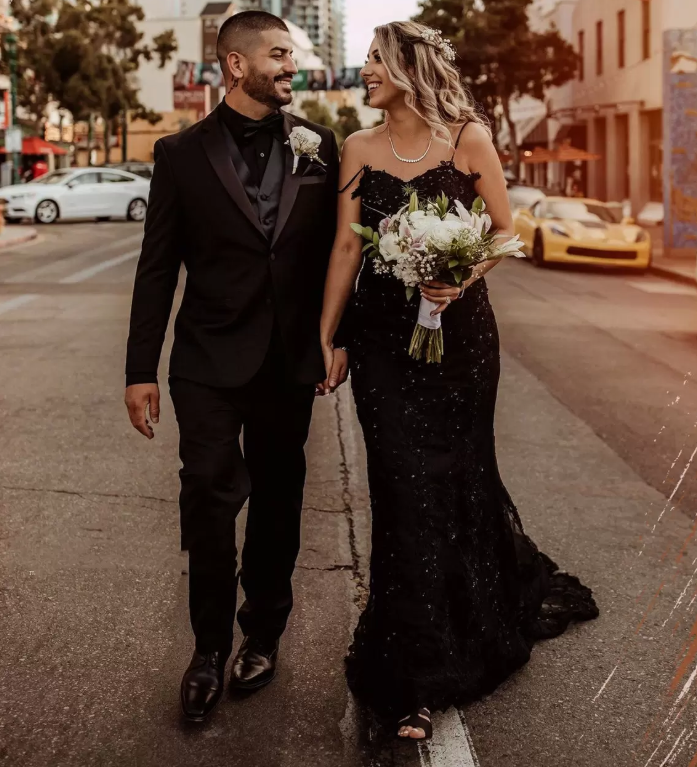 Sparkling Black Mermaid Wedding Dress with Thin Straps and Sweetheart Neckline Lace Appliques Beaded Gothic Bride Dresses