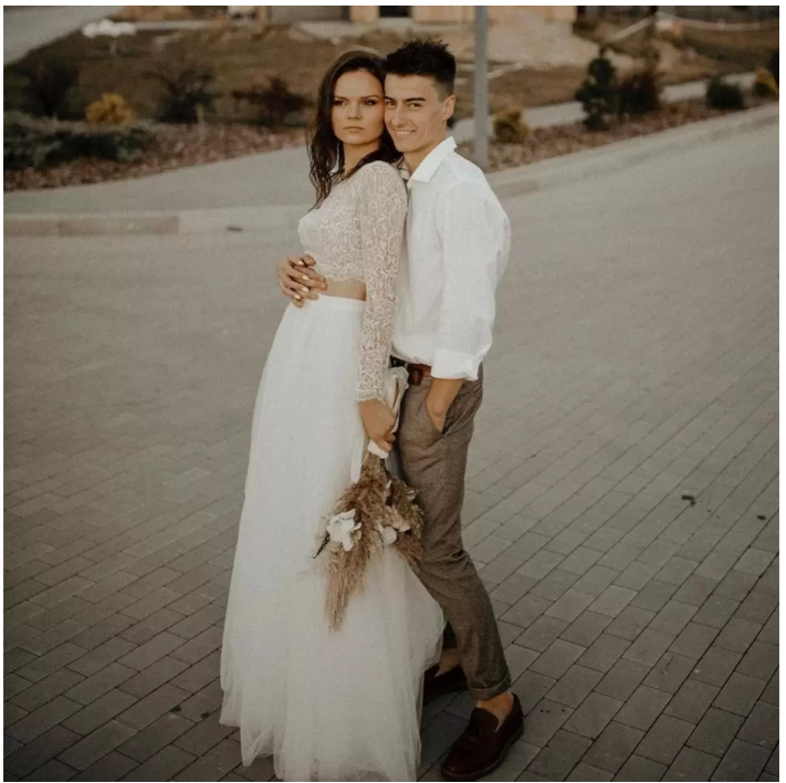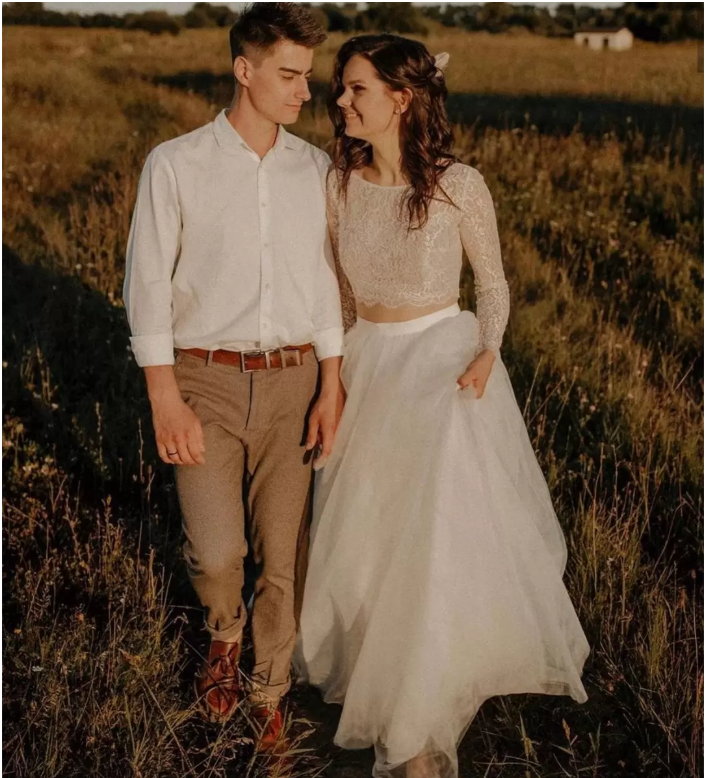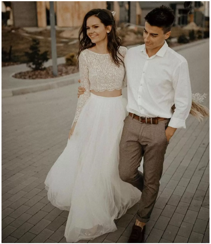 Two Piece Country Wedding Dresses A Line Tops Lace Long Sleeves Ivory Floor Length Boho Beach Wedding Dress