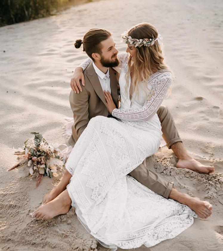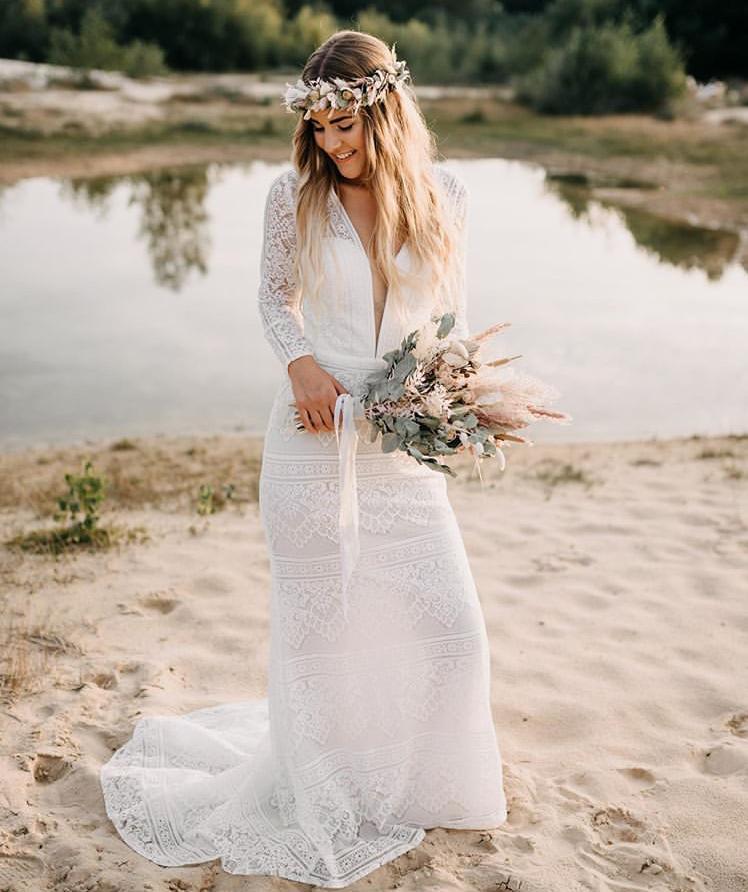 Vintage Lace Long Sleeve Boho Wedding Dresses V-Neck Open back Beach Wedding Bridal Gowns