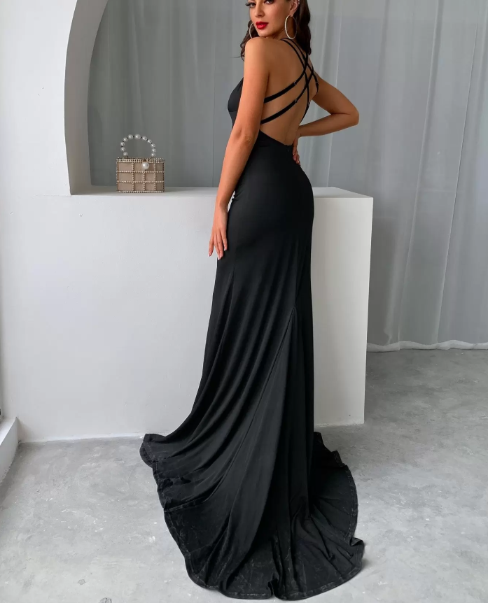 joyfunear Draped Collar Slit Thigh Crisscross Backless Floor Length Prom Dress