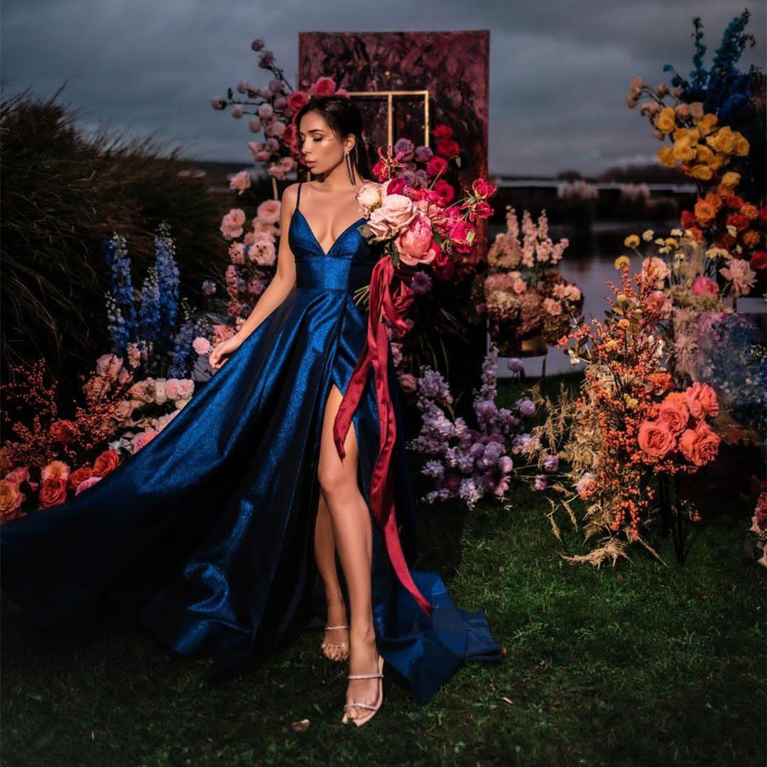 New Arrival A Line Long Prom Dresses Spaghetti V Neck Sexy Cocktail Party Evening Gowns