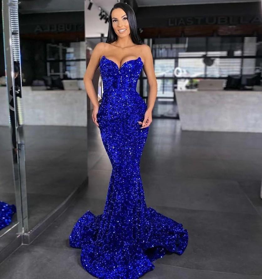 Sexy Blue Sequins Sleeveless Long Mermaid Evening Dresses
