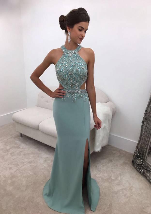 Sheath Jewel Neck Crystals Evening Dresses Side Split Backless Beads Floor Length Prom Dress