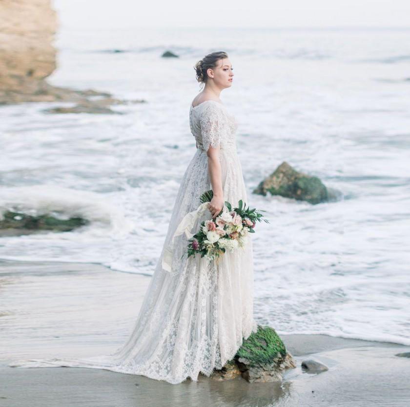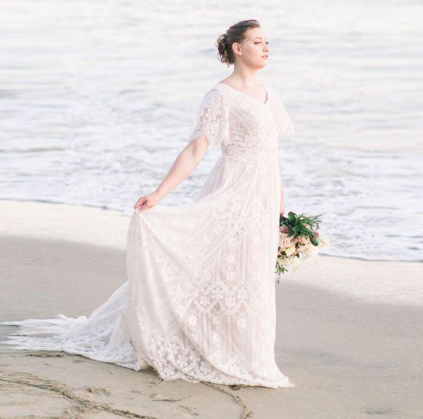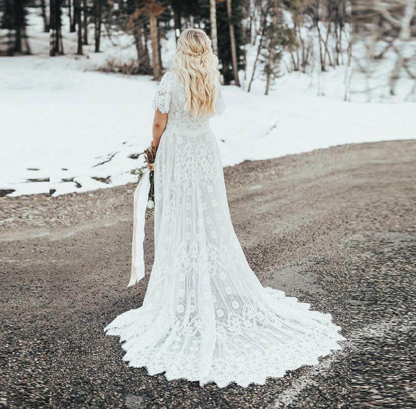 Beach Lace V-neck Short Sleeves Bride Wedding Dress Boho Chic Bridal Gowns