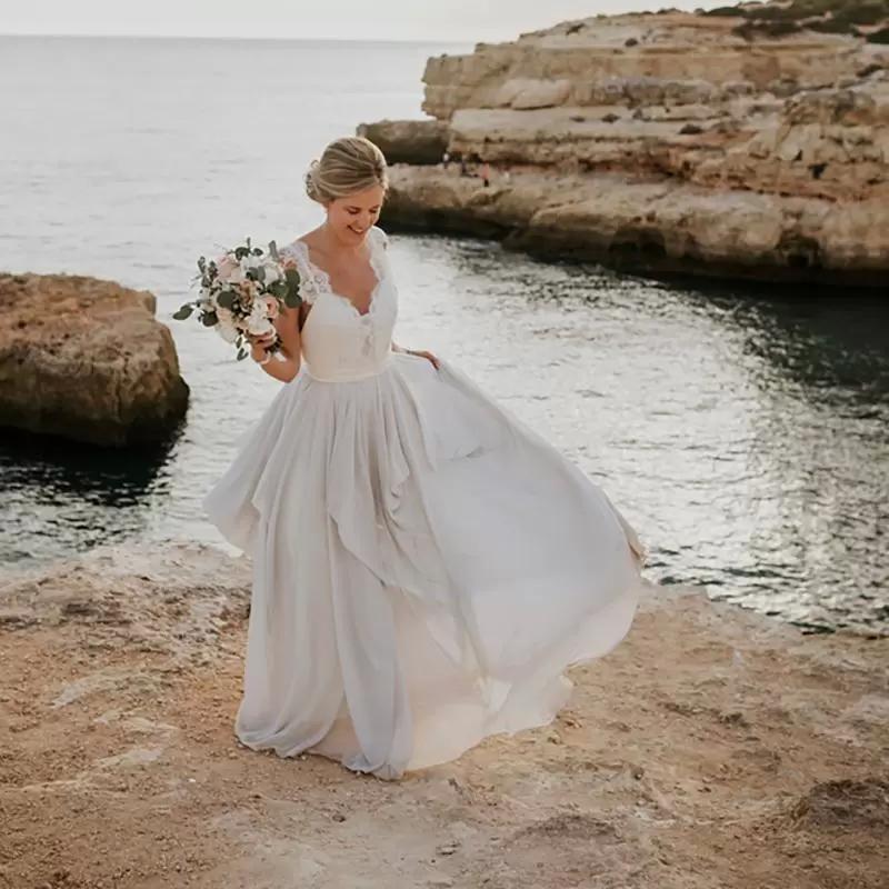 Boho Beach Wedding Dresses Bridal Ball Gown Lace Straps Scalloped Tiered Skirt Chiffon Backless Party Gowns