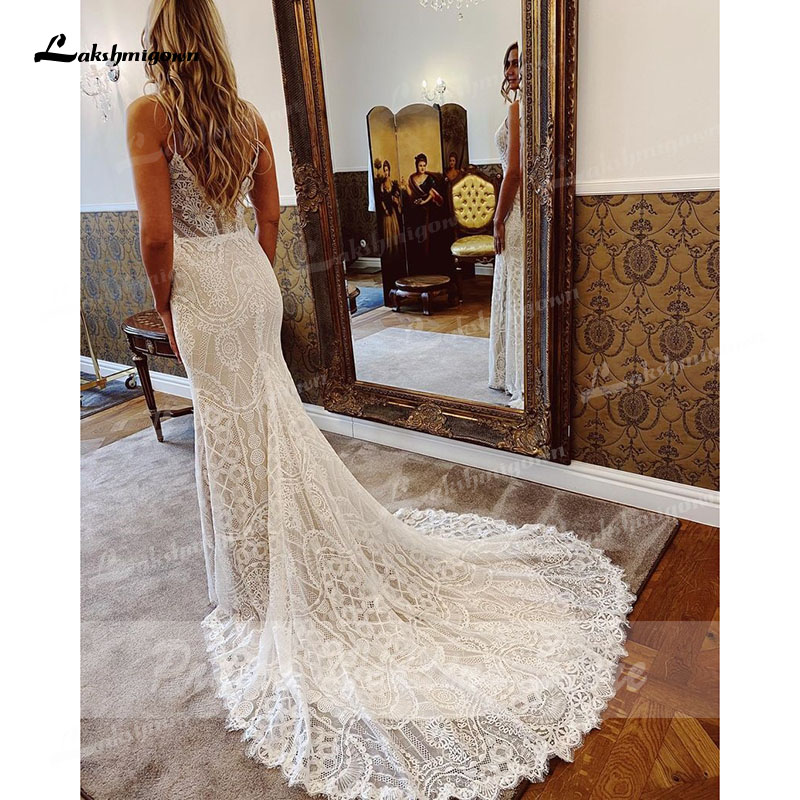 Charming Bohemian Wedding Dress Mermaid Lace Deep V Neck Spaghetti Straps Backless vestido de boda corte sirena Bridal Gown