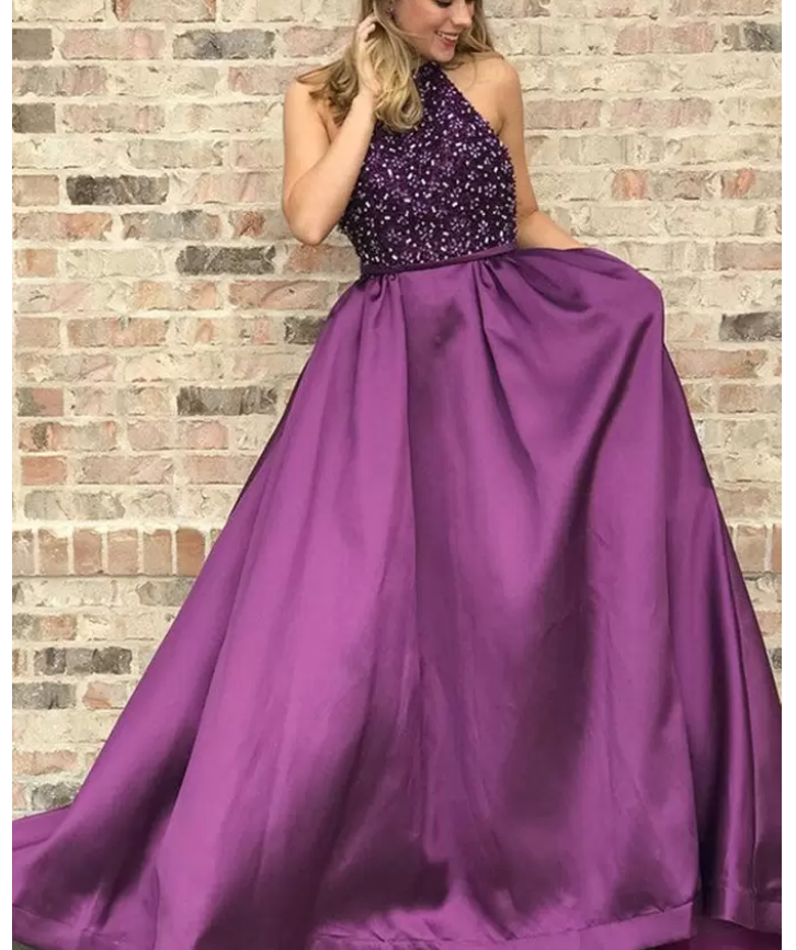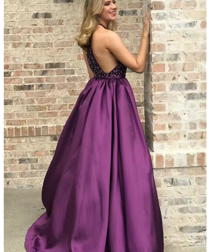 A-line Jewel Neck Beaded Long Prom Dresses Dark Purple Satin Sweep Train Evening Party Gowns