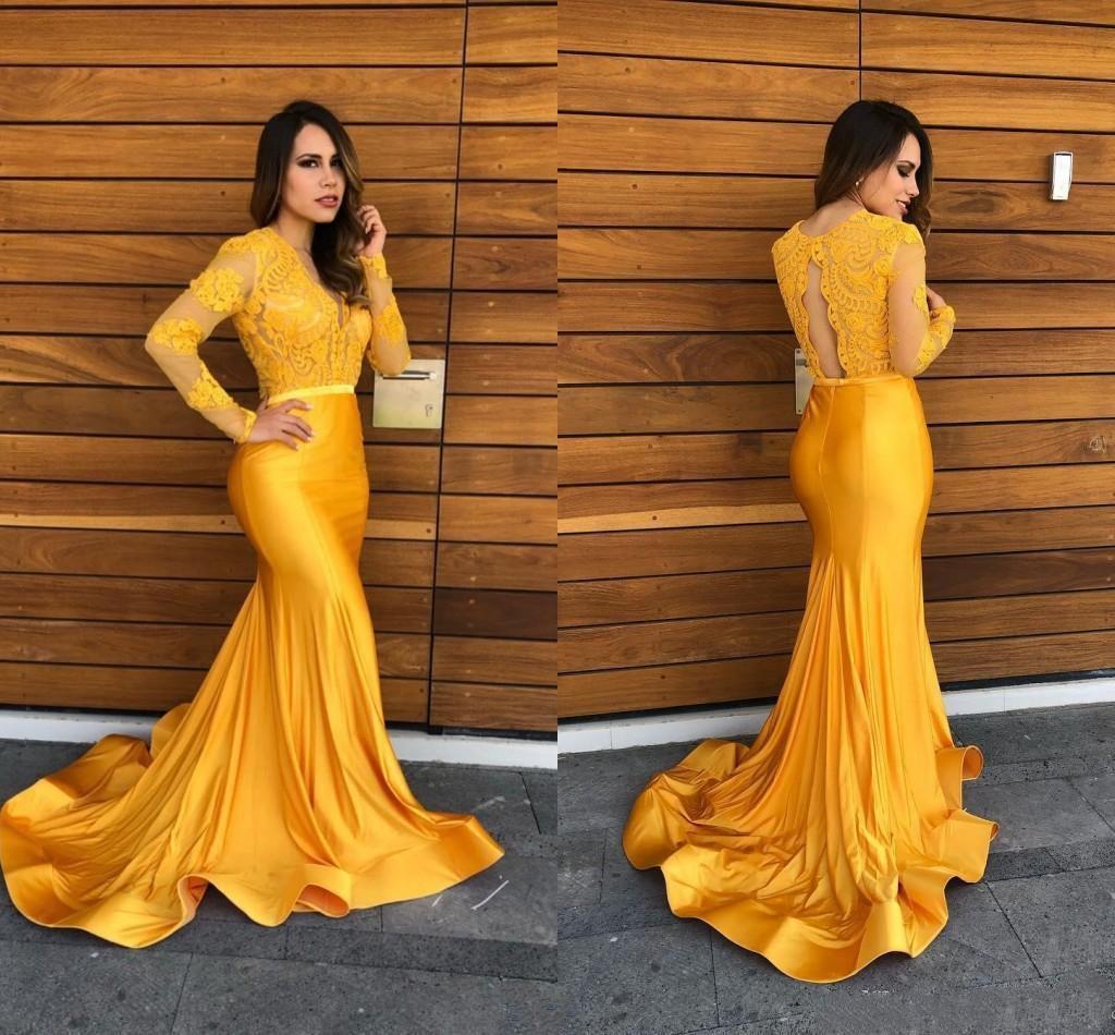 Yellow Lace Mermaid Prom Dresses Sheer Lace V Neck Evening Gowns