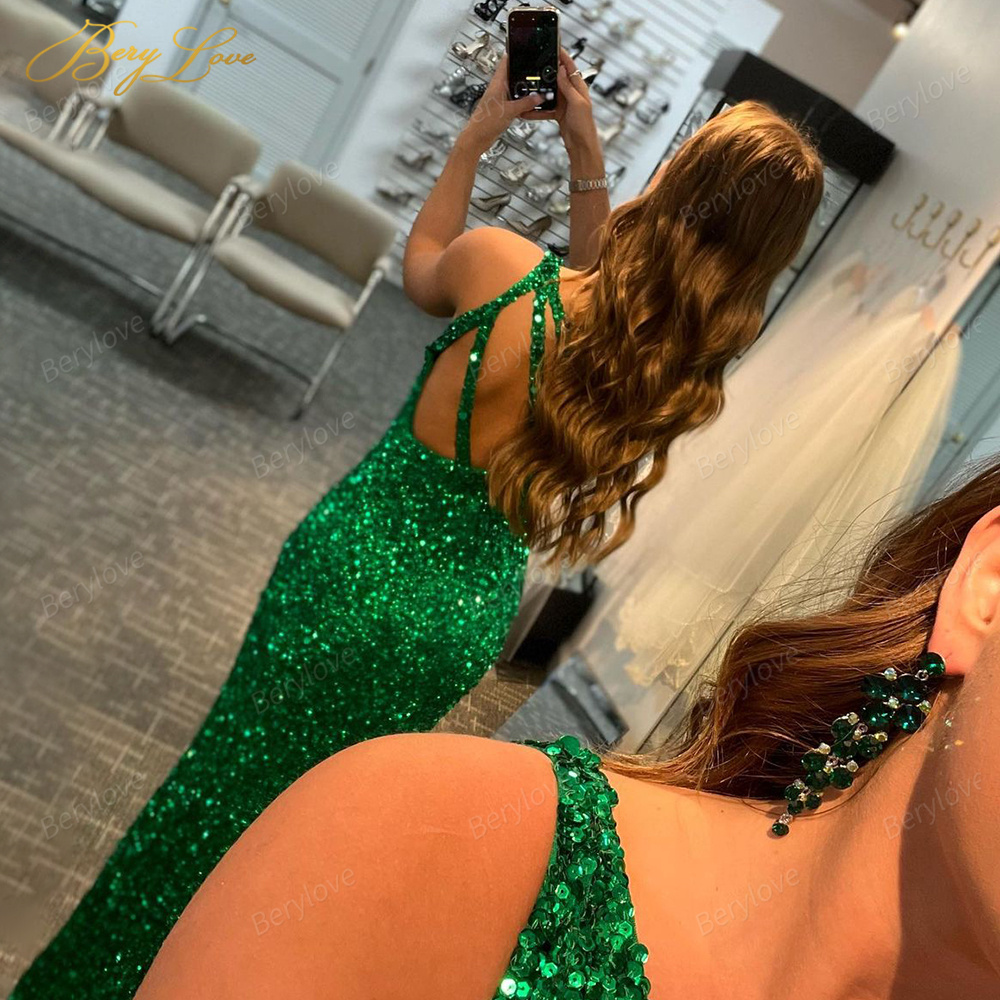 BeryLove Green Glitter Mermaid Prom Dresses One Shoulder Sequin Split Sexy Prom Dress