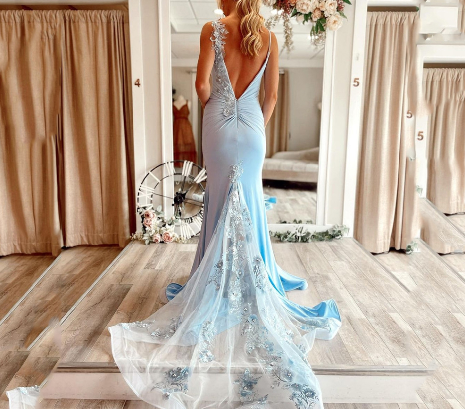 Spaghetti Straps Appliques Soft Stain Evening Dress Backless V Neck Holiday Prom Gown